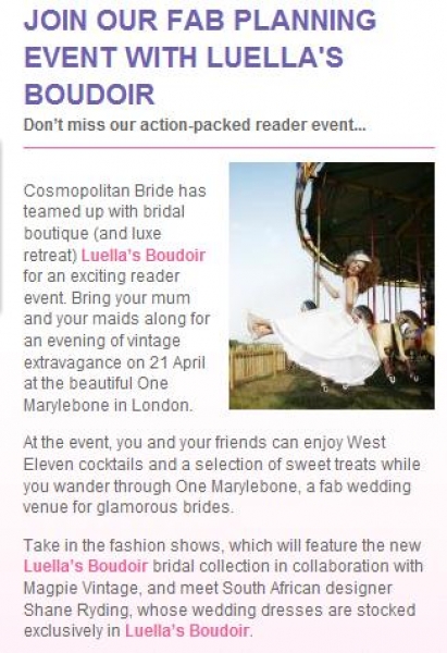 Cosmopolitan Bride has teamed up with bridal boutique Luella’s Boudoir for an exciting reader event. Come along for an evening of vintage extravagance on 21 April at the beautiful One Marylebone in London where you will be able to discuss how Beyond Weddings' interior design expertise can tranform your home as an alternative to traditional wedding gifts.
